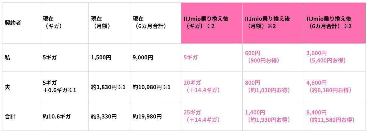 今回のシミュレーションでは、それぞれのスマホ利用状況に合わせて、私が5ギガプラン、夫が10ギガプランでIIJmioに乗り換えた場合の6カ月分を計算してみました。その結果が以下のとおりです。