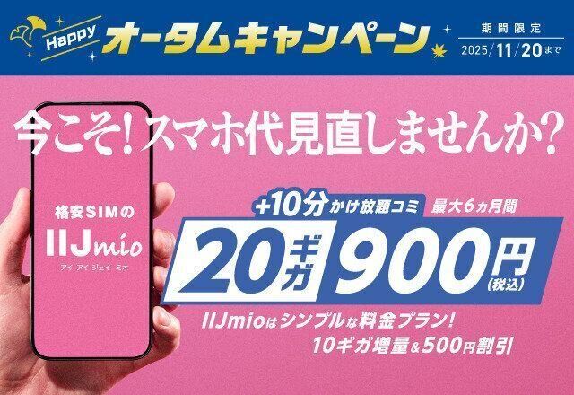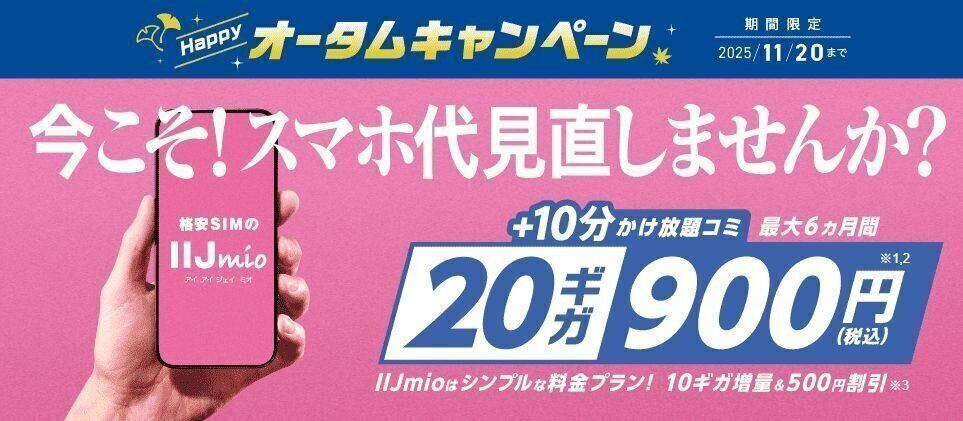 格安スマホのIIJmioで、新規契約者および旧プランからギガプランへの変更を対象とした「ハッピーオータムキャンペーン」が2025年11月20日まで実施中です。