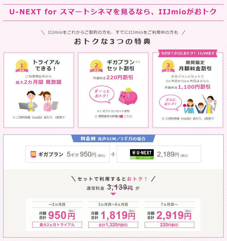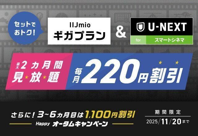 いまや生活に欠かせない存在と言ってもいい、動画配信サービス。しかし、近年はじわじわと値上げが続いており、家計への負担感も増している状況です。そんななか、このオプションを利用すれば、見放題作品数No.1(※)で知られる動画配信サービスの「U-NEXT」が2カ月間見放題になるうえに、ギガプランとセットで申し込むと、IIJmioの月額料金がずっと220円割引!さらに、11月20日までの期間限定キャンペーンも実施中!ギガプランとセットで、3カ月目~6カ月目は月額料金がさらに1,100円割引に!