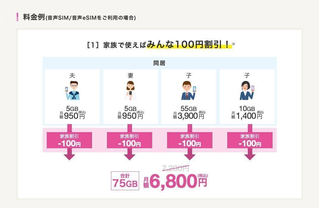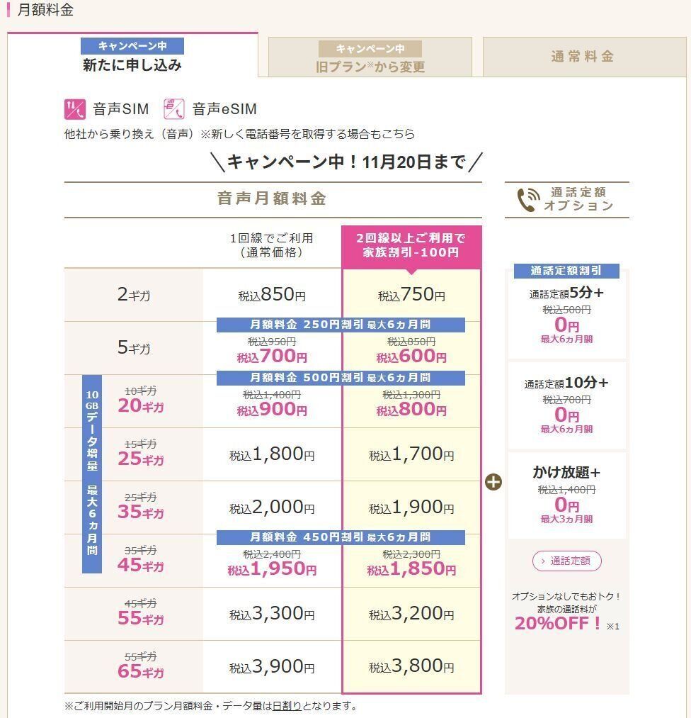 家族4人80ギガ(通話定額10分込み)で月額3,200円!(11月20日まで)