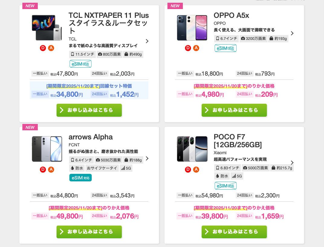「ハッピーオータムキャンペーン(11月20日まで)」では、スマホ本体の購入もお得です。他社からIIJmioに乗り換えの場合、なかにはワンコインで買える機種や、定価から35,000円割引になる機種もあります。
