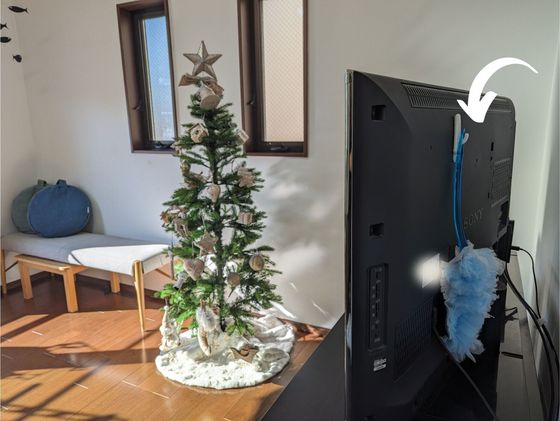 テレビ裏にフックを取りつけてハンディワイパーを忍ばせておけば、掃除へのハードルがぐんと低く。テレビまわりから始めて、そのまま棚全体→窓台まで一気に済ませても1分弱で完了!