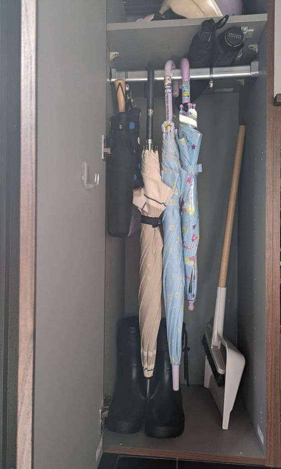 ここでのマイベストは、無印良品の『掃除用品システム ほうき(¥690)』と、別売りの木製ショートポール(¥1,490)の組み合わせ。収納が少ない玄関でも場所を取らずにしまえて、ちりとり(¥390)にセットすれば毛先が傷みにくいのがお気に入りポイントです。