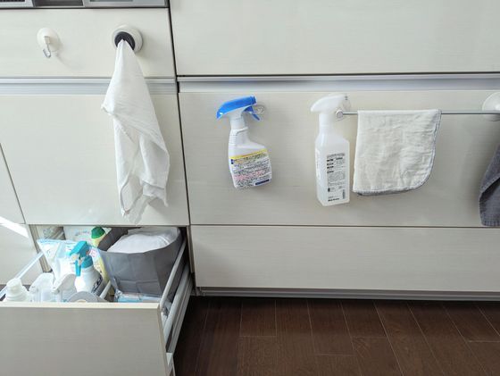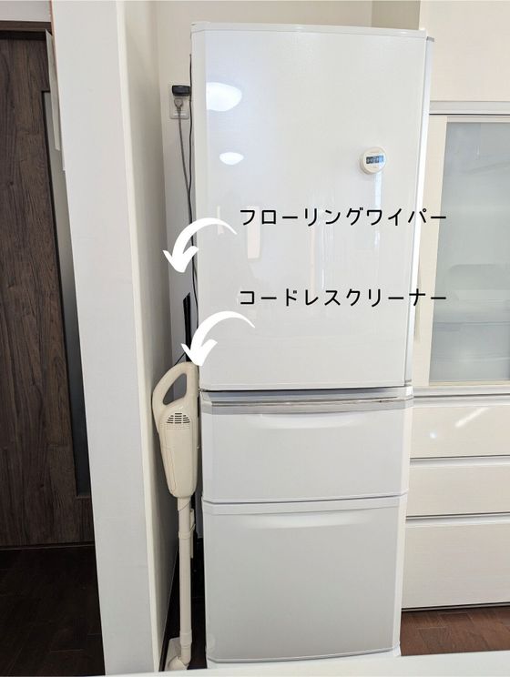 掃除機がけ終わりにそのまま水拭きに移れるように、ぞうきんを取りつけるフローリングワイパーはコードレスクリーナー横に、ぞうきんとスプレーはまとめてキッチン収納の一角に定位置を設けています。