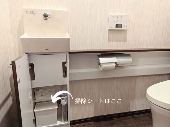 シートは手洗いボウル下にほかの掃除グッズとまとめて収納。ストレスなく取り出せるから、ちゃんと目覚めていない朝でも自然と身体が動きます。