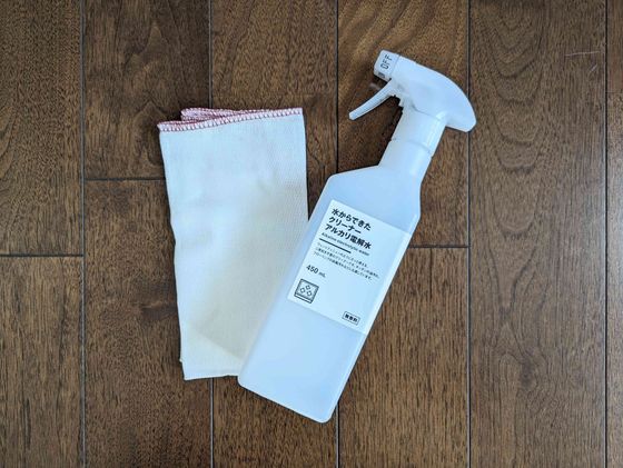料理中出しっぱなしにしていたモノを片づけたら、油汚れに強くて二度拭き不要の、無印良品『水からできたクリーナー アルカリ電解水(499円)』で、電子レンジ、ワークトップ、コンロ周りを拭きあげます。この時使う布巾は、これまた無印の『落ちワタ混ふきん12枚組(499円)』。