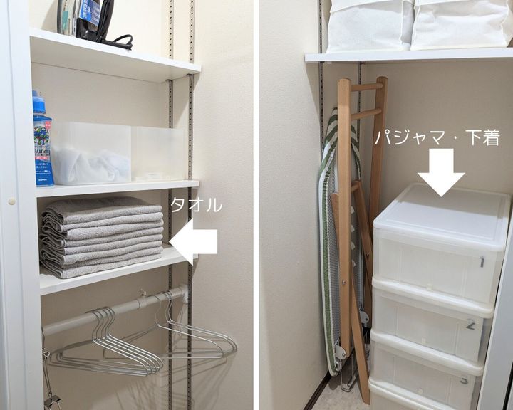 洗濯機前からほとんど動かずに片づけられるのが、①脱衣所。ここには下着やパジャマ、タオルなど、乾燥機で乾かすものを収納しています。どれもお風呂上がりに使うので、動線的にもここがぴったり。
