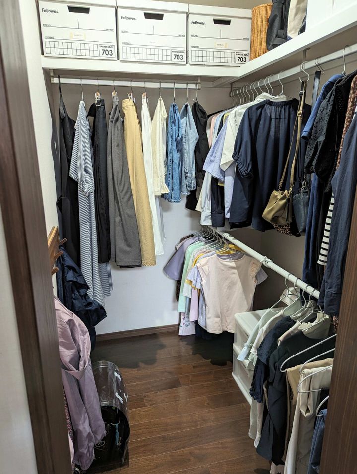 ハンガーに干した衣類は、全て➁ファミリークローゼット行き。ここに家族4人分の洋服をまとめて収納しているから、それぞれの部屋に出入りして戻す手間をカットできます。