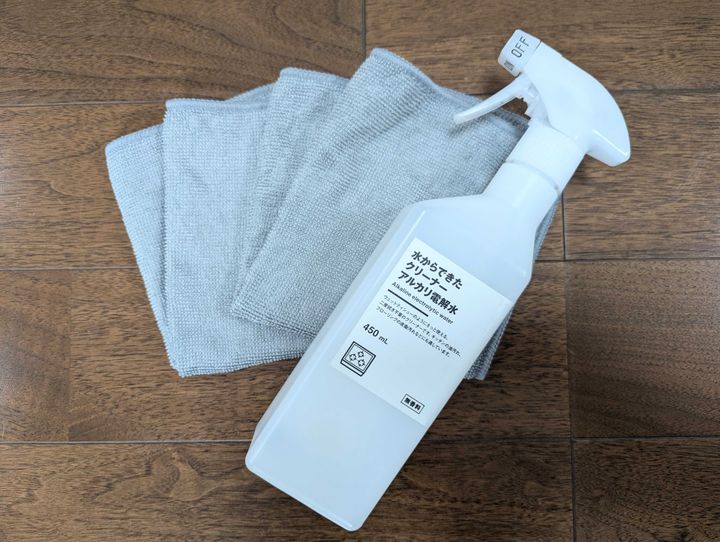 使い方はとっても簡単。ぬらしたマイクロファイバークロスにアルカリ電解水を数回スプレーして水拭きし、その後乾いたクロスで拭き上げるだけ。
