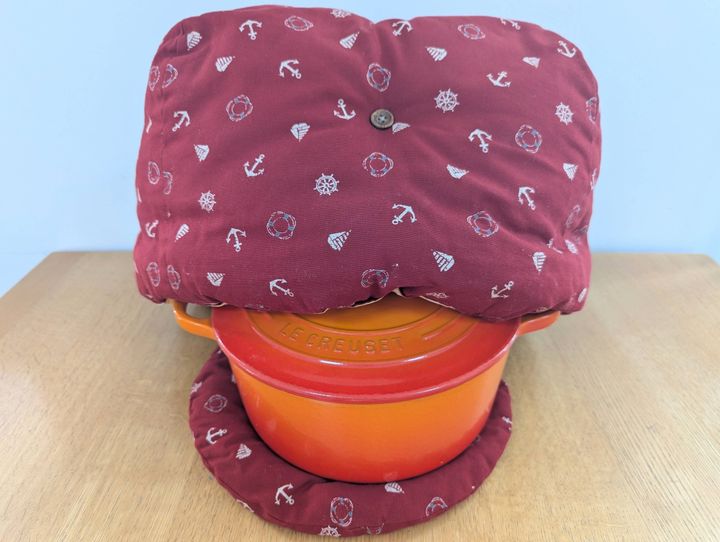 「全国友の会」で企画・販売されている鍋帽子は、27cmの両手鍋まで対応しているので、ほとんどの鍋がすっぽり収まります。お値段も税込み3,500円と、保温調理用の鍋を買うよりずっとお手頃。