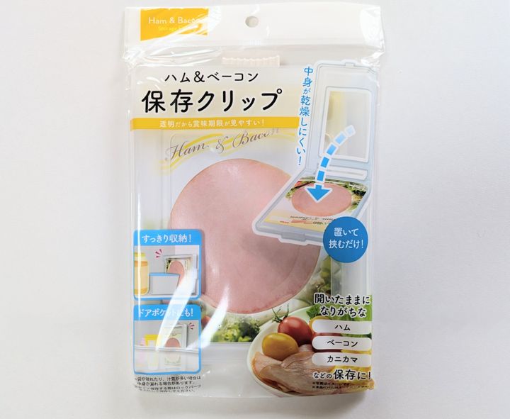 開封済みのハムやベーコン、カニカマなどをパッケージごと挟むだけで、乾燥を防げる便利グッズです(税込み 110円・JANコード:4905687384190)。横135mm×縦170mmまでの標準的なパッケージに対応していますが、横幅が多少はみ出す程度は大丈夫。