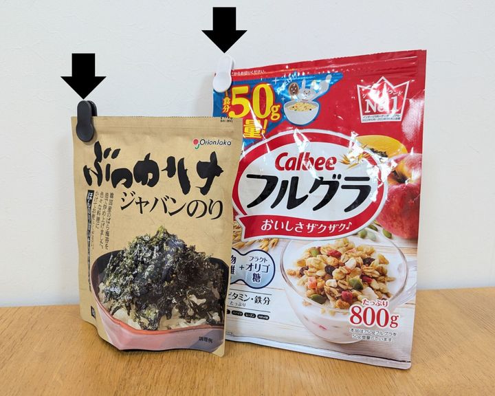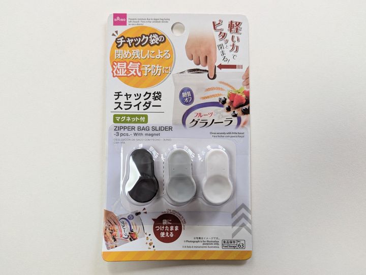 チャック袋につけるだけで、チャックが閉めやすくなり、閉め残しによる湿気も防げる便利グッズ(税込み 110円・JANコード:4549131906738)。わが家では、グラノーラと韓国のりの保存に重宝しています。