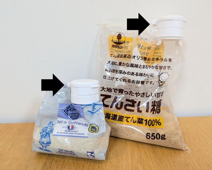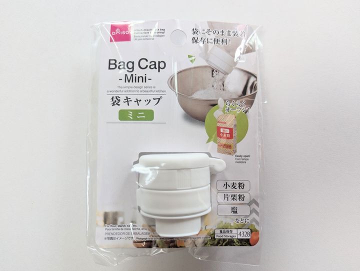 小麦粉や砂糖、塩など、袋入りの食品に取りつけて、キャップとして使えるアイテム(税込み 110円・JANコード:4550480094328)。わたしは、保存容器に入りきらなかった砂糖と塩の袋につけて使っています。