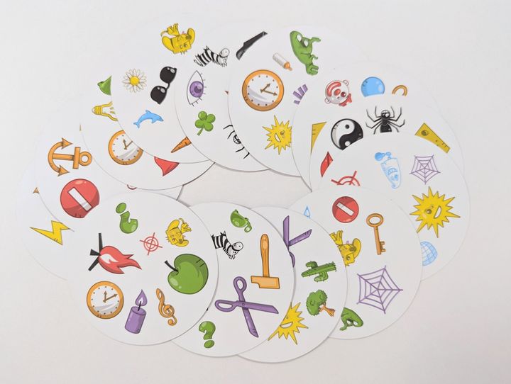 カードに描かれたマークの中から、共通するものをいち早く見つけるゲーム。マークは50種類以上あり、各カードにはそのうちの8つがランダムに描かれています。5通りの遊び方に合わせて、カードを獲得したり手放したりして勝ち負けを競います。