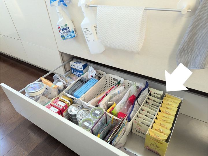 わが家では、肉と野菜がバランスよく摂れる豚汁と、1食に約半個分の玉ねぎが入っているオニオンスープをストックしています。どちらも子どもたちも大好き。日常的に使う乾物や乾麺と同じキッチンの引き出しに収納して、手に取りやすく在庫が一目で分かる状態に。