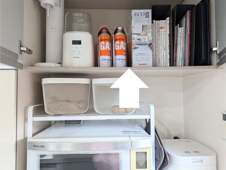 日常的に使いやすくするためのポイントは、そこそこ手に取りやすい場所に収納すること。頻繁に使うアイテムではないからこそ、奥にしまい込むと存在を忘れがち。わたしの場合は、他の道具の出し入れの邪魔にならず、自然に目に入るキッチンの吊り戸棚が最適解でした。