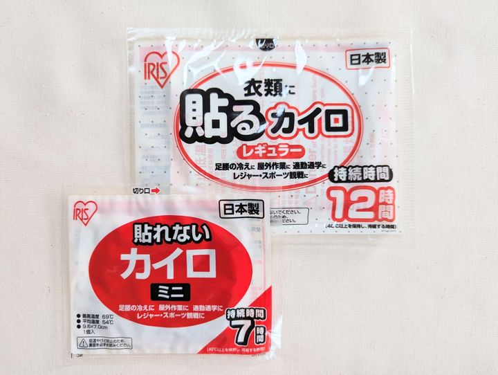 貼るタイプや貼らないタイプ、大きさもさまざまですが、わが家で常備しているのは、使い慣れたレギュラーサイズの貼るタイプ(12.5×9.5cm)とミニサイズの貼らないタイプ(9.6×7.0cm)の2種類。箱買いしておき、寒い季節には外に長時間いる日や、お腹まわりを温めたい生理中などに活用しています。