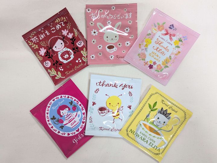 紅茶専門店・カレルチャペックの紅茶は、味が良いのはもちろん、オーナーの山田詩子さんが手がけるパッケージデザインがとにかくかわいいのが魅力。そのデザインが映えるように、あえて透明の袋でラッピングしています。手渡した瞬間に「わぁ!かわいい!」と喜んでもらえる、私的鉄板アイテム。