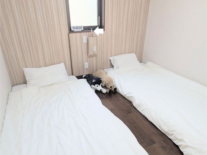 ほかには、寝室の窓枠に取りつけて、ティッシュケースをつり下げ収納。収納家具がない部屋ですが、このフックのおかげで、布団まわりに必要なモノを床に置かずに済むので、掃除がしやすく助かっています。