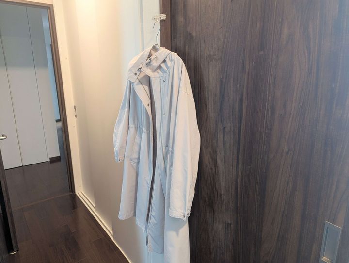 雨で濡れたアイテムは、ここでしっかり乾かしてからクローゼットに戻せば、湿気がこもらず快適です。安定感があり、アウターをかけても安心。フックにほどよい厚みがあるので、かけたものが壁に密着しにくく、壁がびっしょり...という心配もありません。