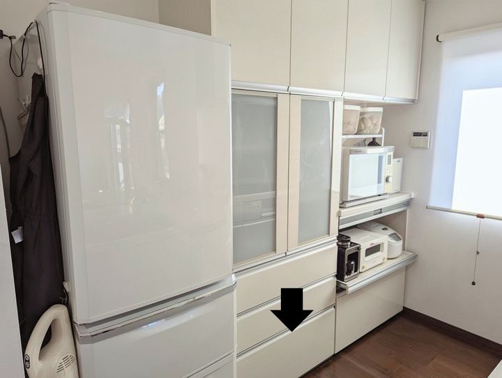ドライヤーをここに収めている理由は、小学生の娘2人がリビングで髪を乾かすのがルーティーンだから。以前は洗面所に収納していましたが、出し入れが面倒だったようで、寝る前のタスクがなかなか進まない...!リビングと続きのキッチンに場所を移したことで、動きがぐっとスムーズになりました。