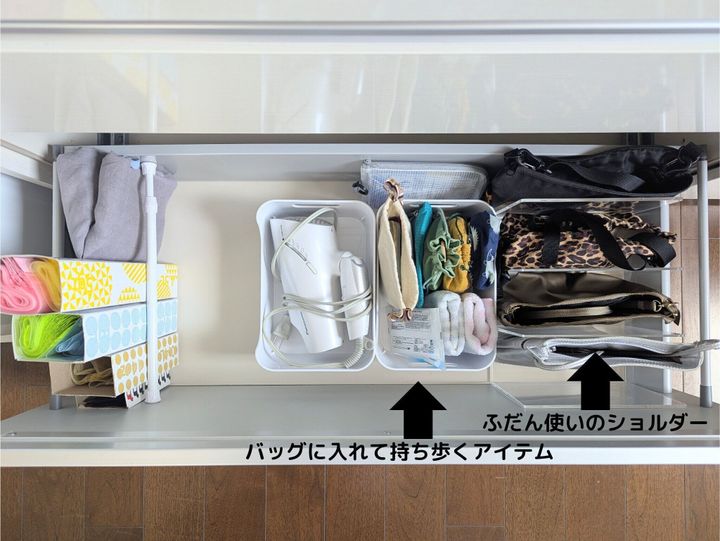 また、ショルダーバッグとその中身をキッチンに収納しているのは、わたしの行動の起点がキッチン~LDKにあるから。外出の前後はほとんどこのエリアにいるため、ここに収納スペースを設けておくと、帰宅後にサッと片付けられて置きっぱなしを防げます。
