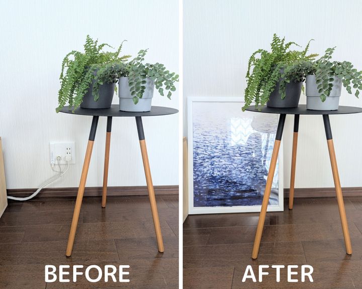 使っているアイテムは、A2(420×594mm)より少し小さめサイズのポスター。これまではその時々の気分に合わせて飾ったり片付けたりしていましたが、コンセントを隠せるポジションを定位置に。いかにも「隠しています」という感じにならず、インテリアに溶け込んでくれるところが気に入っています。