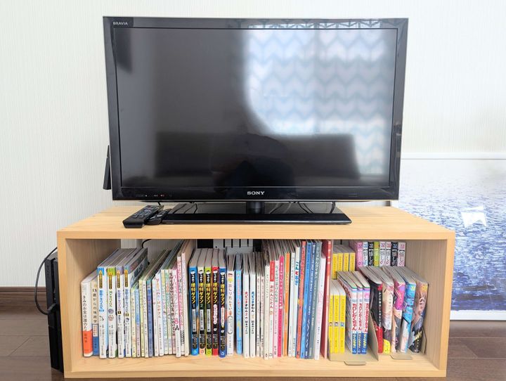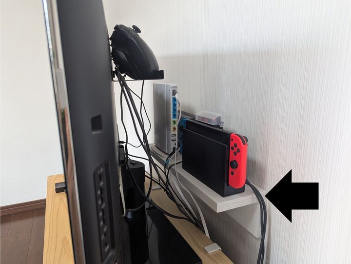 そこで取り入れたのが、無印良品の「壁につけられる家具棚(44cm・ライトグレー・税込み 2,490円)」。これをテレビ後ろの壁に取り付けて、Wi-Fiルーター・ONU・Switch本体を浮かせて設置。すっきりした見た目と快適なWi-Fi環境を両立させています。浮かせることで、テレビまわりの掃除がしやすくなるのもうれしいポイント。