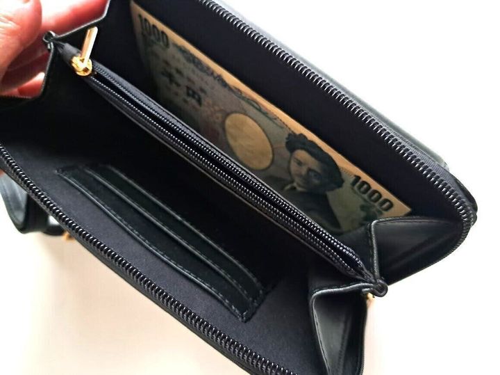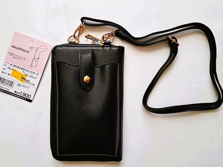 最近、ひんぱんに目にするスマホが入るショルダーですが、スマホだけが入るものは比較的お安く、どこでも手に入ります。ただこれは、お財布のようにしっかりとしたファスナー付きのポーチで金具も金色なので、非常に高見えする商品になっています。