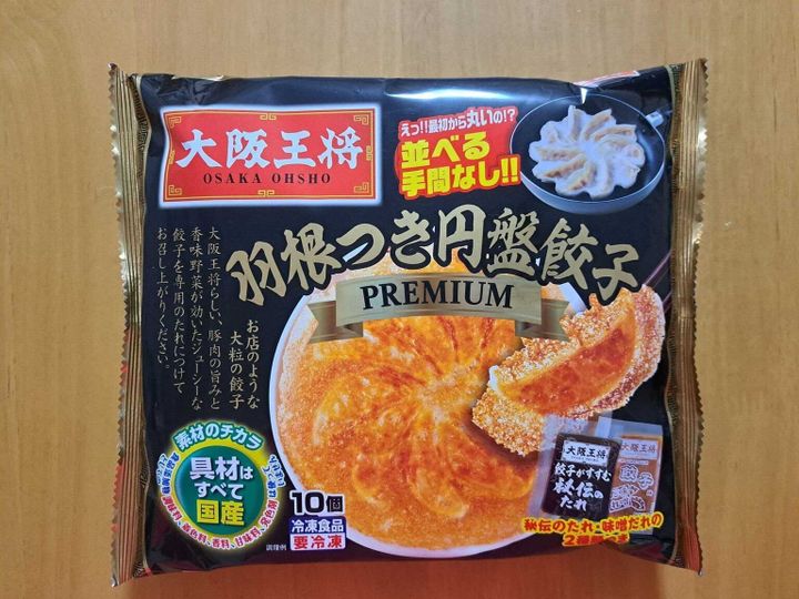 今回、おつまみ部門で受賞した餃子は、通常販売してる大阪王将の餃子と違い、「羽根つき円盤餃子」となっていて、「プレミアム」と書かれています。通常の大阪王将の冷凍餃子と何が違うのか?冷凍されている形も、そのまま丸形で全部くっついているので、ポンとフライパンに入れるのが非常に簡単で、楽々です。