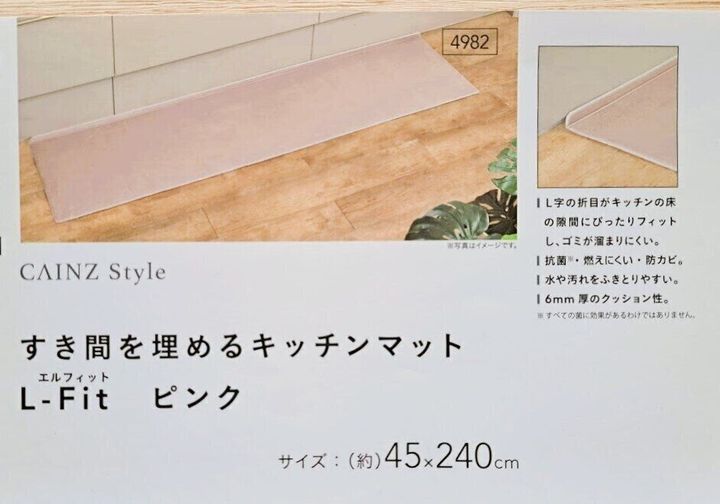 そのL字の折目が床とキッチン部分のすき間にぴったりフィットするため、ゴミがたまりにくい設計になっています。こんな商品いままで見たことなかったのですが、キッチンマット自体も、そうそう頻繁に買い替えるものでもないので、今はこんなことになっているのか!と驚きました。