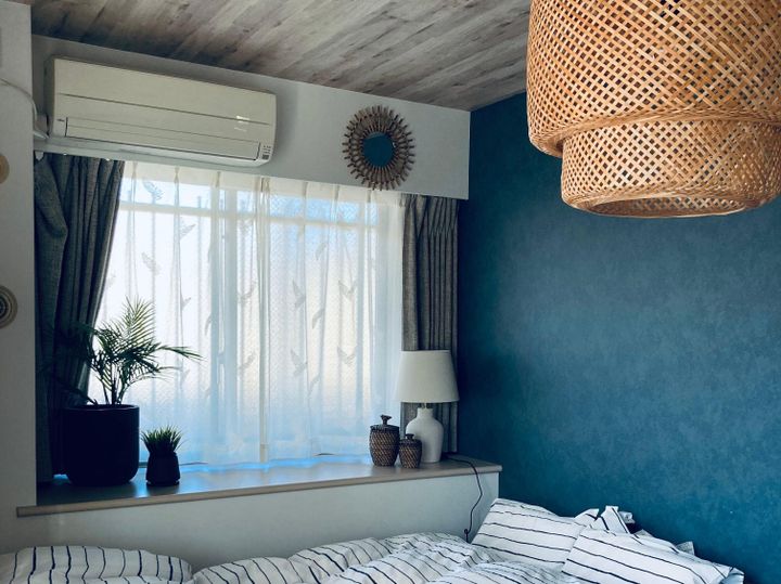 寝室は、部屋のイメージにぴったりなレースのカーテンに一目惚れ。即採用しました。