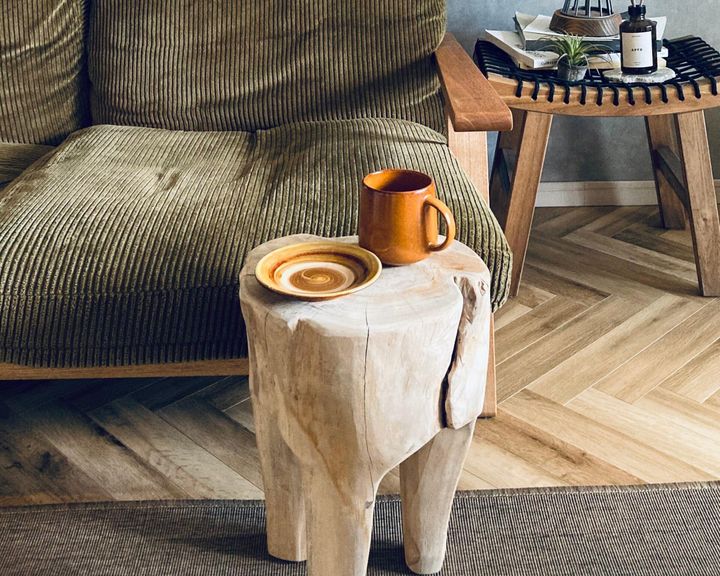 わが家には5歳の息子がいて、リビングでおもちゃを広げて遊ぶのが日課です。10畳ほどの広さにダイニングとソファがあり、空間の確保は至難の技。その為コーヒーテーブルの代わりにスツールを使用しています。幅30cmあれば、マグカップと皿が置け、ソファ横に設置すれば、リラックスタイムのお供に最適な家具になります。