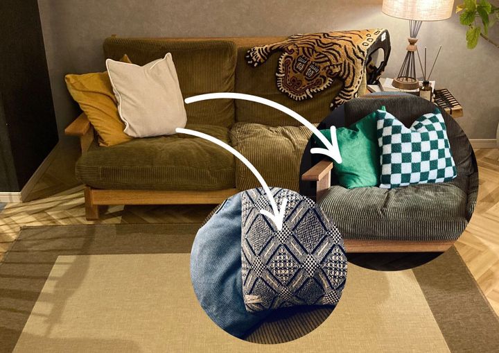 はじめにご紹介したい方法が「クッションカバー」を変えること。ソファーの配置を変えなくても、クッションの色や素材が違うだけて、見慣れた部屋の印象が変わります。