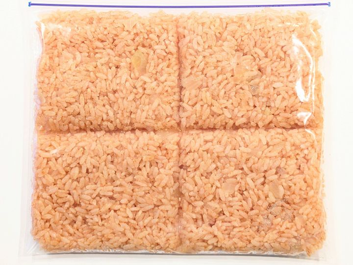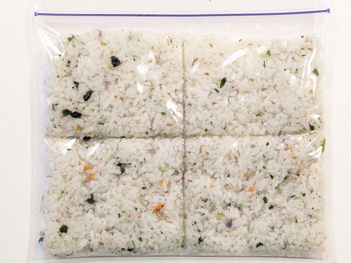 ご飯はジッパー付の保存袋に入れて平らに保存すると、冷凍庫ですっきりと収納できます。