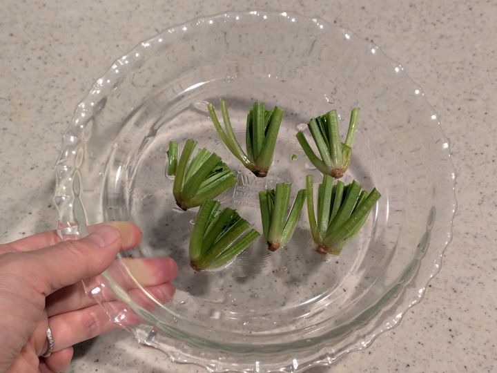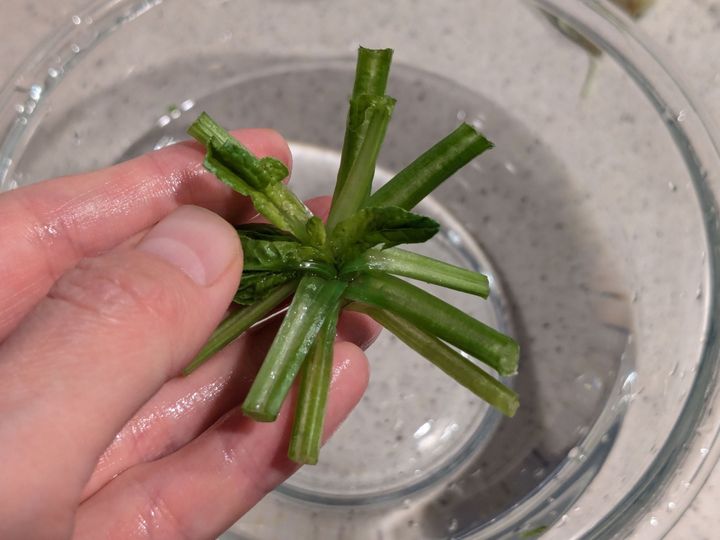 葉の部分は除き根元のみを耐熱皿にのせ、電子レンジ600Wで10~20秒加熱します。