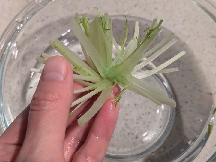 水を溜めたボウルに入れ、水にくぐらせながら根元をしっかり洗います。