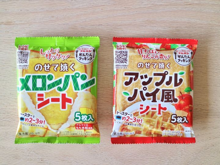 アップルパイ風シートは、切り込み入れず、フィルムを片面剥がしてそのまま食パンの上にのせ、のこりのフィルムを剥がしてトースターで焼きました。焼き時間は、メロンパンシートと同じ2〜3分との記載でしたが、アップルパイ風シートはすこし焼きが物足りなく感じたので、私は少しずつ時間を足して、結局3分半焼きました。