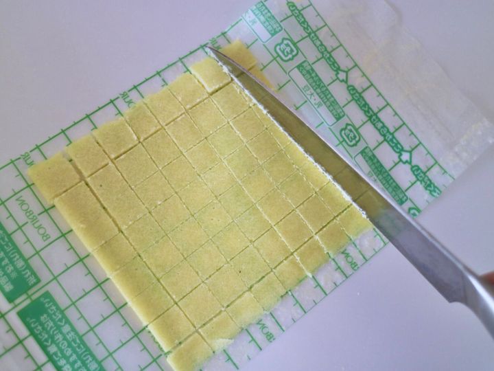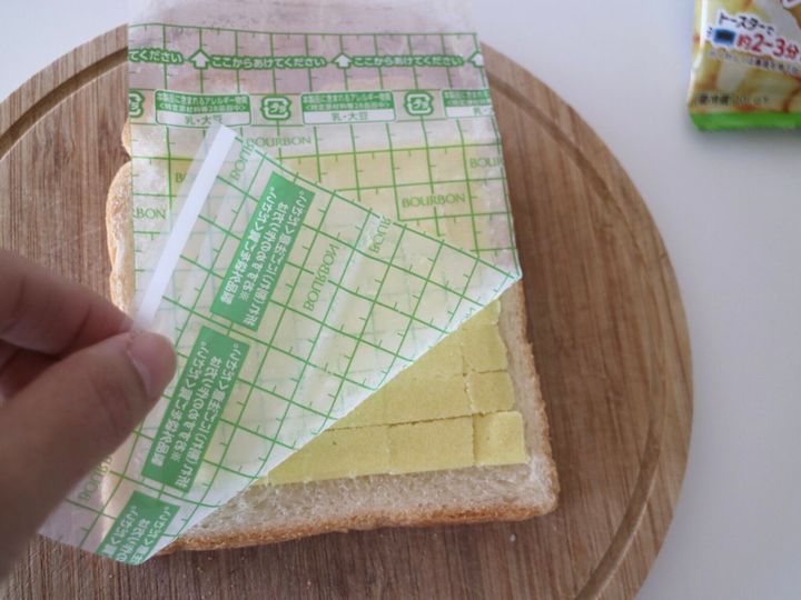 フィルムの片面をはずして食パンの上にのせるだけなのですが、メロンパンシートは、フィルムの線に沿って切り込みをいれるとよりメロンパンっぽくなるとの記載があったので切り込みを入れてみました。