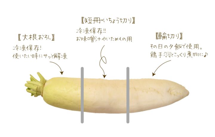 大根は上のほうが苦味が少なく水分量が多いのでおろしに向いていて、逆に下のほうは煮物に向いています。冷凍保存する場合は、その特徴を活かしながら、自分が使いやすい大きさにあらかじめカットしておきます。