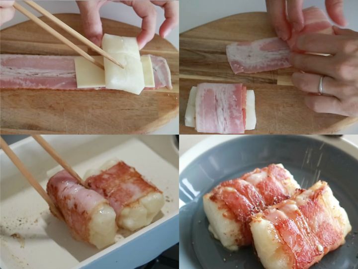 カリッと香ばしく焼けたベーコンと、中からとろ〜っととろけるチーズがお餅と絡んで相性抜群!