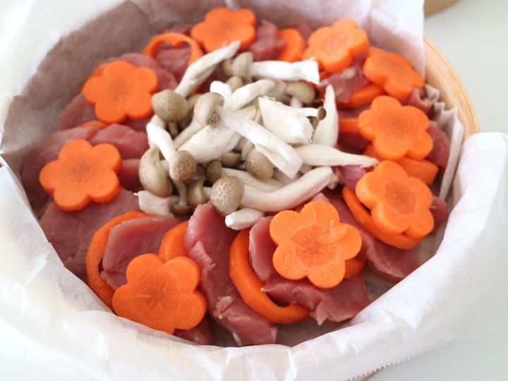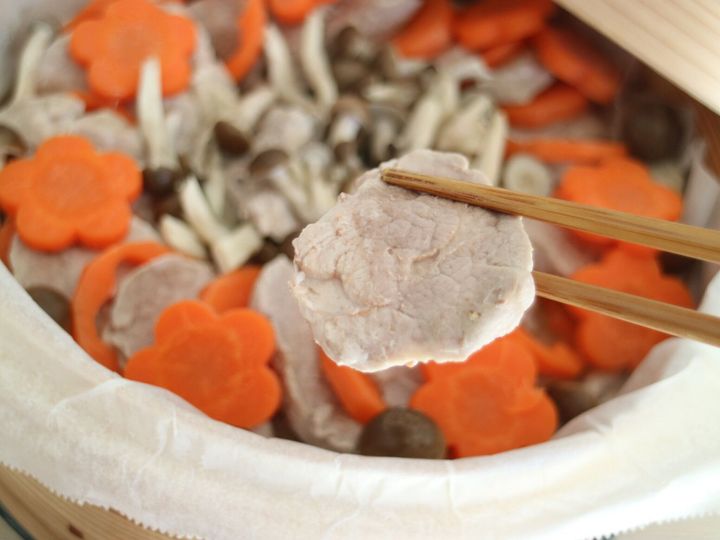 こんかいは、豚のヒレブロック肉をつかいました。脂身もすくないので蒸籠でも調理しやすいですよ。