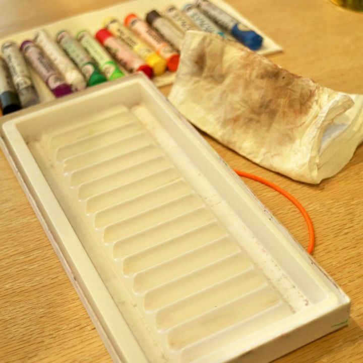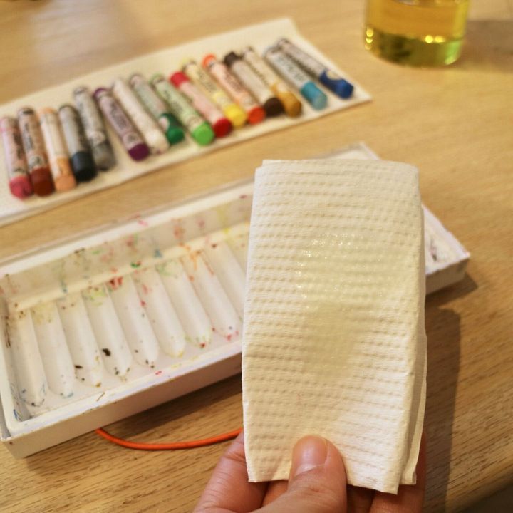 キッチンペーパーを軽く折り曲げて、少量のオリーブオイルを染み込ませたら、あとはクレヨンの汚れを拭き取るだけです。クレヨンケースの中はプラスチックの仕切り容器でできているものが多いと思うので、かんたんに拭くことができます!(紙製のものも汚れを落とせますが、オイルが染み込んでシミになってしまう可能性があるので気になるかたはおすすめできません。)