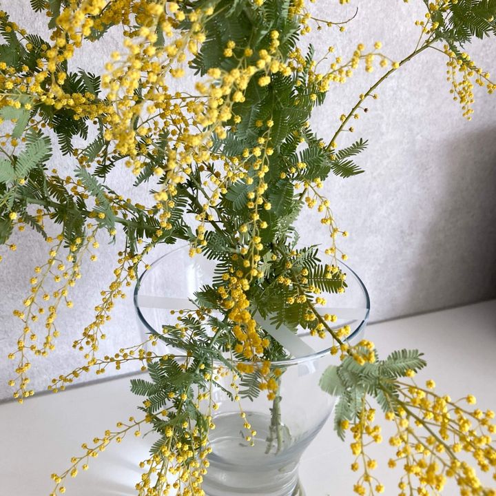 ミモザがだらんと倒れてしまっていますね。フラワーベースの口が広いタイプのものなので、どうしてもこのように倒れてしまいます。