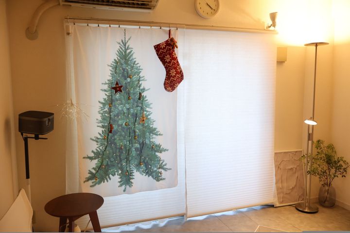 タペストリーに飾りつけを安全ピンで留めたまま畳んで保管。シーズンの際は出して壁に掛けるだけ。