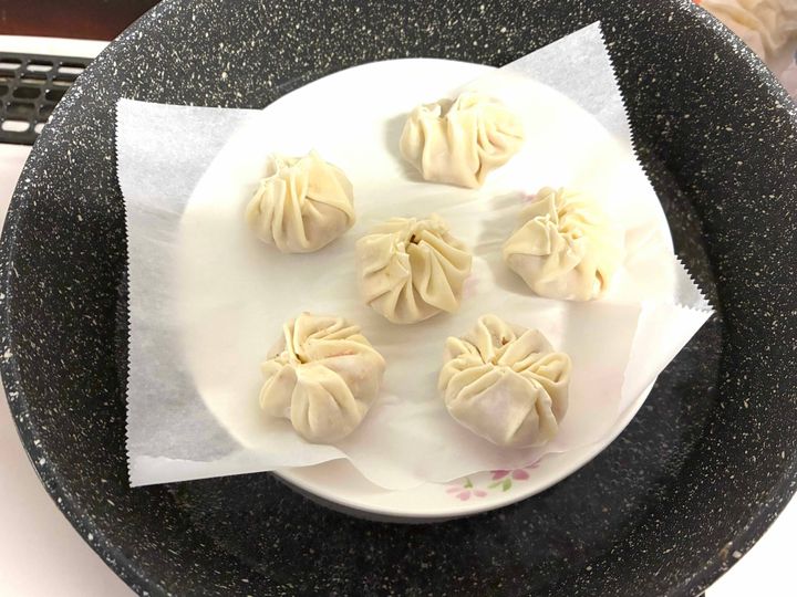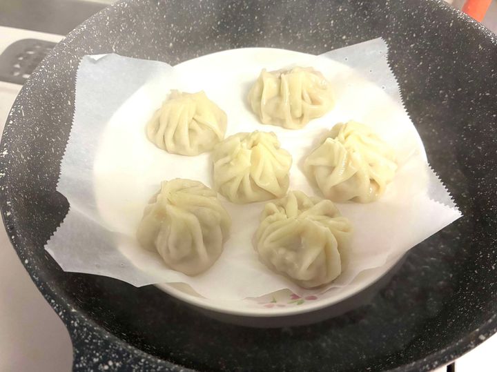 (5)フライパンに耐熱皿を乗せ、お湯沸かす。クッキングシートを敷いてその上に小籠包を並べる。