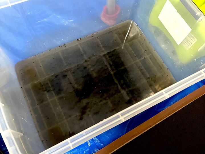 クリーニングの際、7年間放置したエアコンから出た汚れを見せてもらいました。真っ黒な液体から、相当な汚れが蓄積していたことがわかります。今回依頼した業者の方も「もう少しこまめにクリーニングした方がよさそうですね」とおっしゃっていました。
