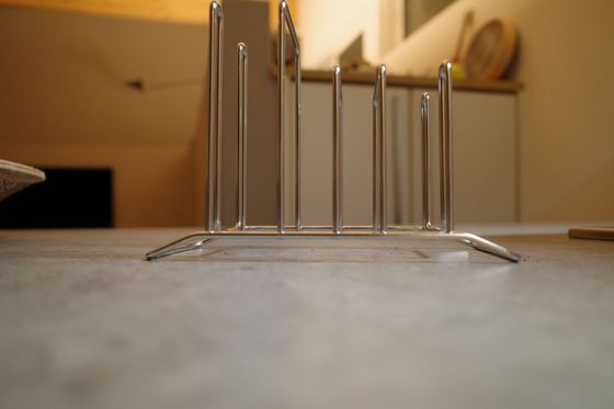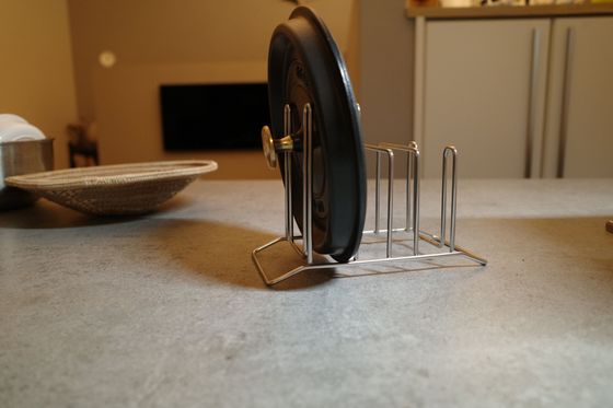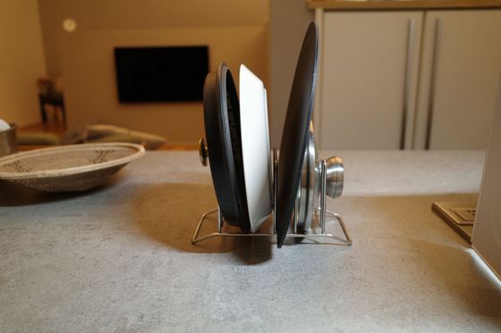 調理と洗浄が同時に進むキッチンに、「ステンレスキッチンスタンド」があるおかげで、「途中一旦鍋洗った鍋のフタを立てかけておく場所」ができます。しかも水切りしながら。限られたスペースのキッチンでは本当に助かります。