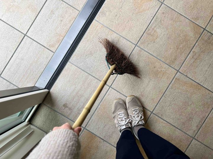 ポイントは、靴を履いているタイミングを狙って掃除をすること。掃除をするために、靴やサンダルを履くのではなく、履いているうちにやってしまうのです。そこで良いタイミングとして見つけたのが、朝子どもを園へ送り出し、帰宅したその時。すぐに家の中へ入って行きたくなりますが、玄関に収納してある外ほうきを取り出して、ササっと掃く。外ほうきは、玄関のシューズクローゼット内や扉の近くに引っ掛けておくと、すぐに取り出せて便利です。