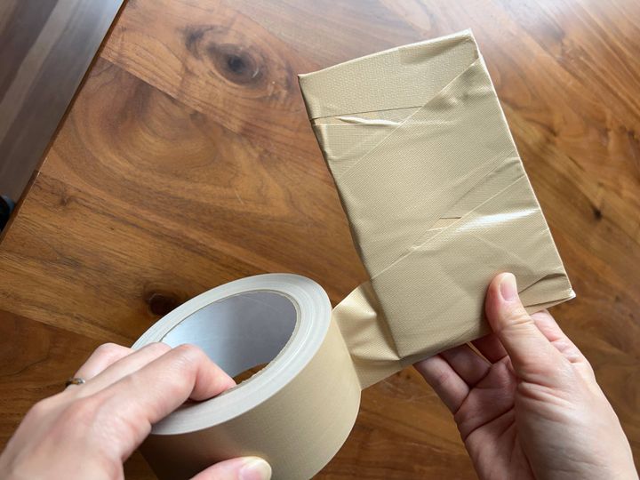 保管期間を過ぎたもの、手放すと決めたものは処分をしますが、その方法はとても簡単。ガムテープでぐるぐる巻きにするだけです。ガムテープは粘着力が強い布製がオススメ。数枚を一束にして、個人情報を隠しながら、年賀状だと分からなくなるくらい全体を何重にも巻いていきます。それをそのまま可燃ゴミや資源ゴミの日に出しますが、分別方法は自治体によって異なりますので、確認してから処分をしましょう。
